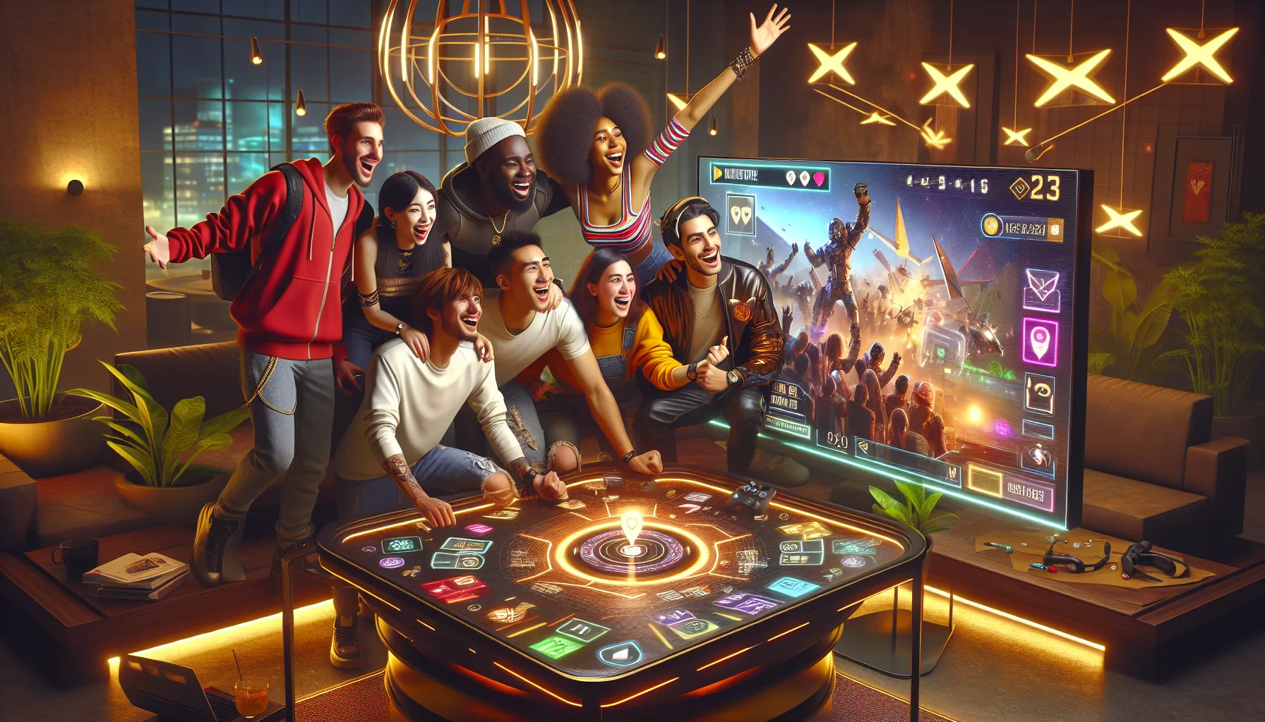 a diverse group of friends gaming together in a modern setting.